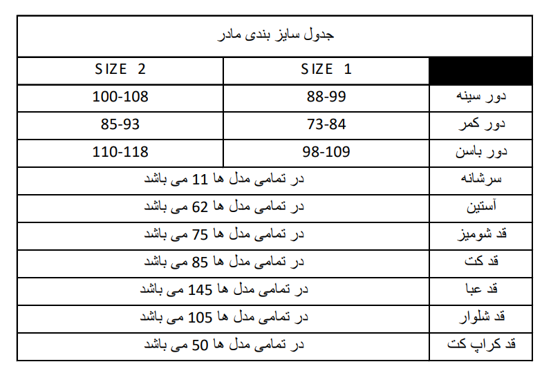 *سایز 1 مادر شامل سایزهای 38-40-42 و سایز 2 مادر شامل سایز های 44-46-48 می باشد(برای انتخاب دقیق طبق جدول سایز خود را انتخاب کنید